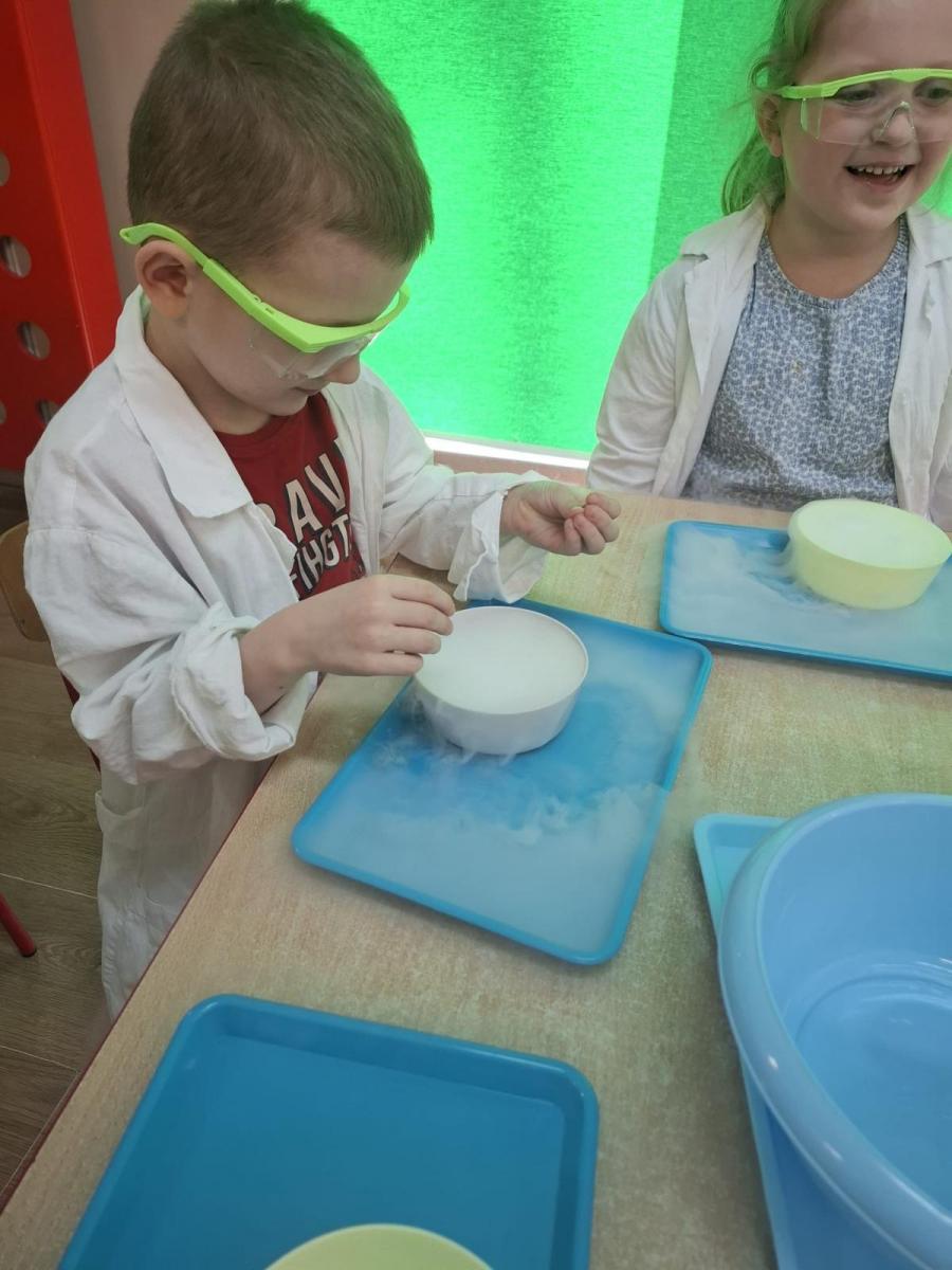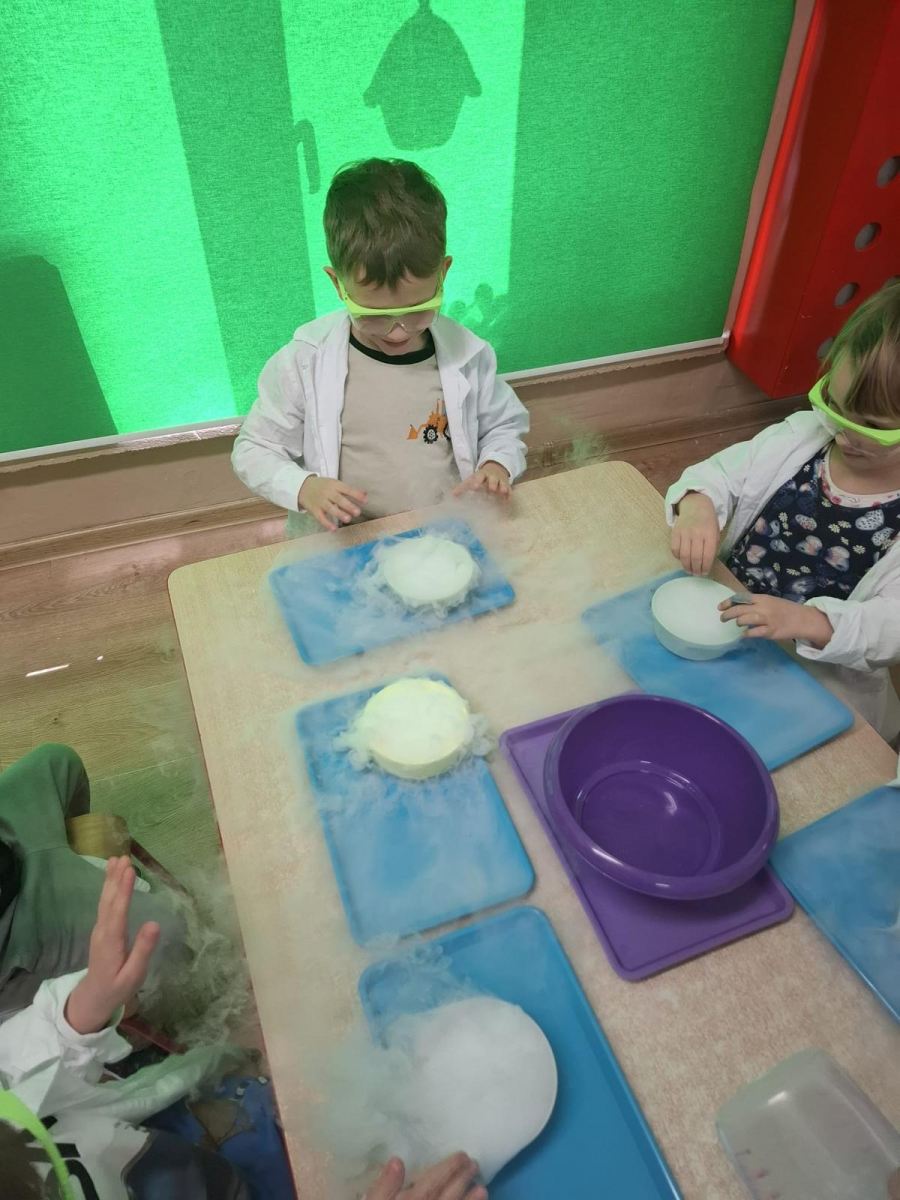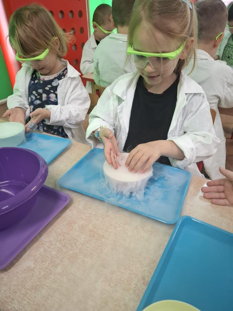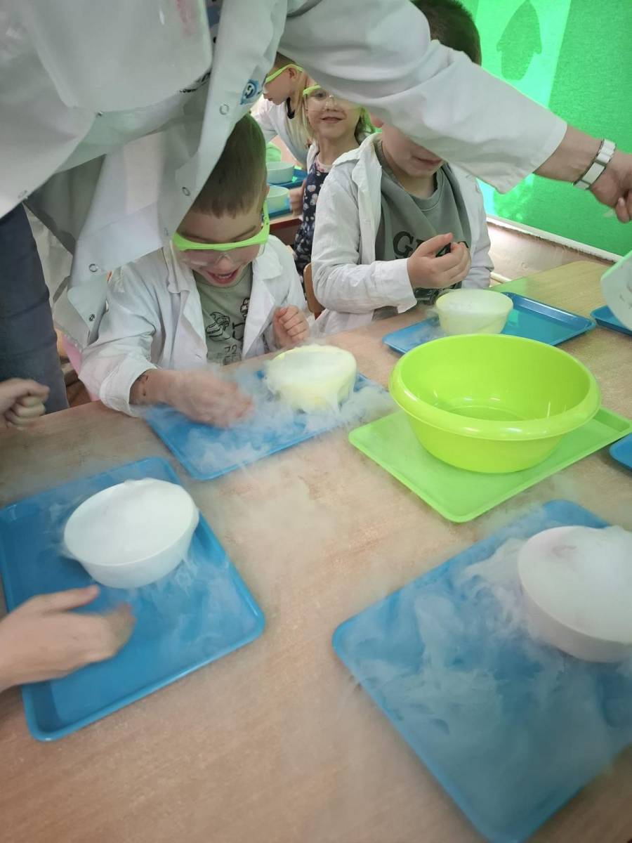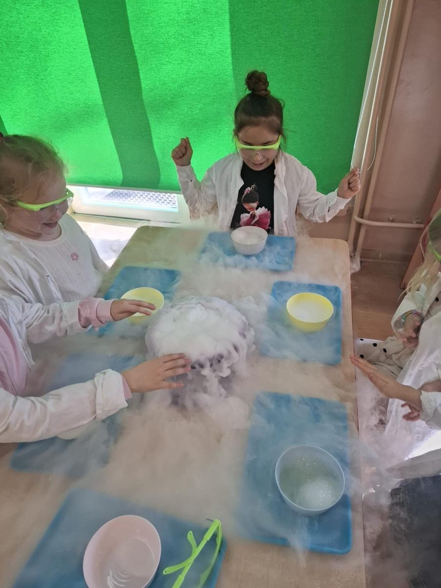 Główną atrakcją było doświadczenie z suchym lodem, dzięki któremu dzieci mogły zaobserwować zjawisko sublimacji – przejścia ze stanu stałego bezpośrednio w gazowy, z pominięciem stanu ciekłego. Warsztaty nie tylko dostarczyły mnóstwo radości, ale także rozbudziły ciekawość świata i chęć poznawania nauki poprzez zabawę.