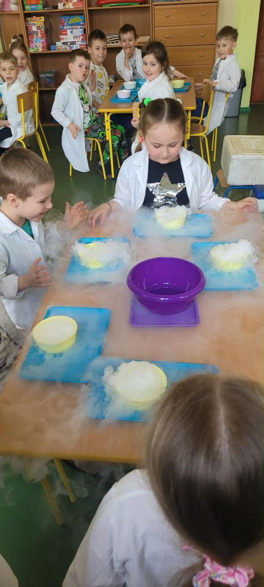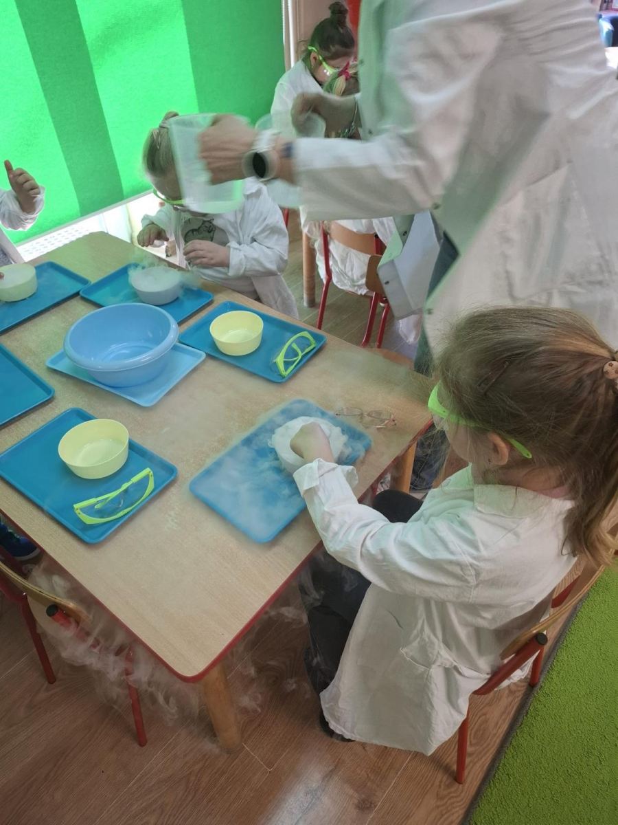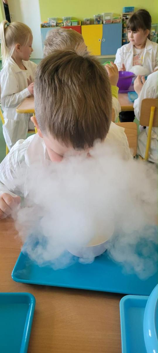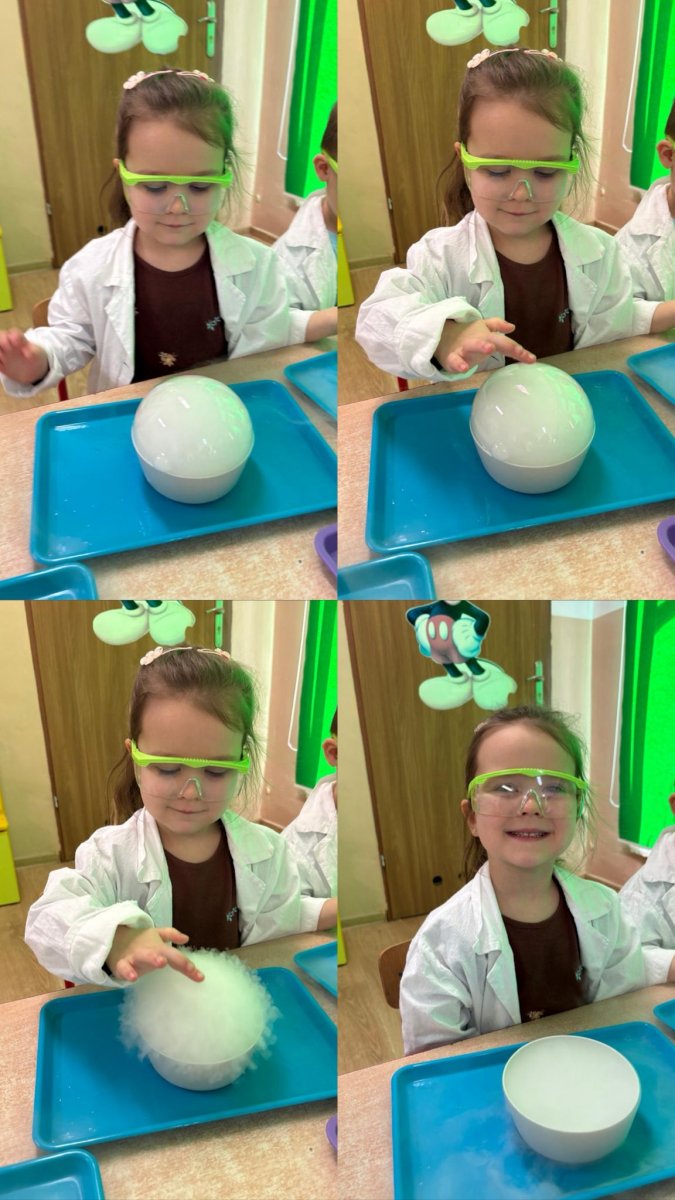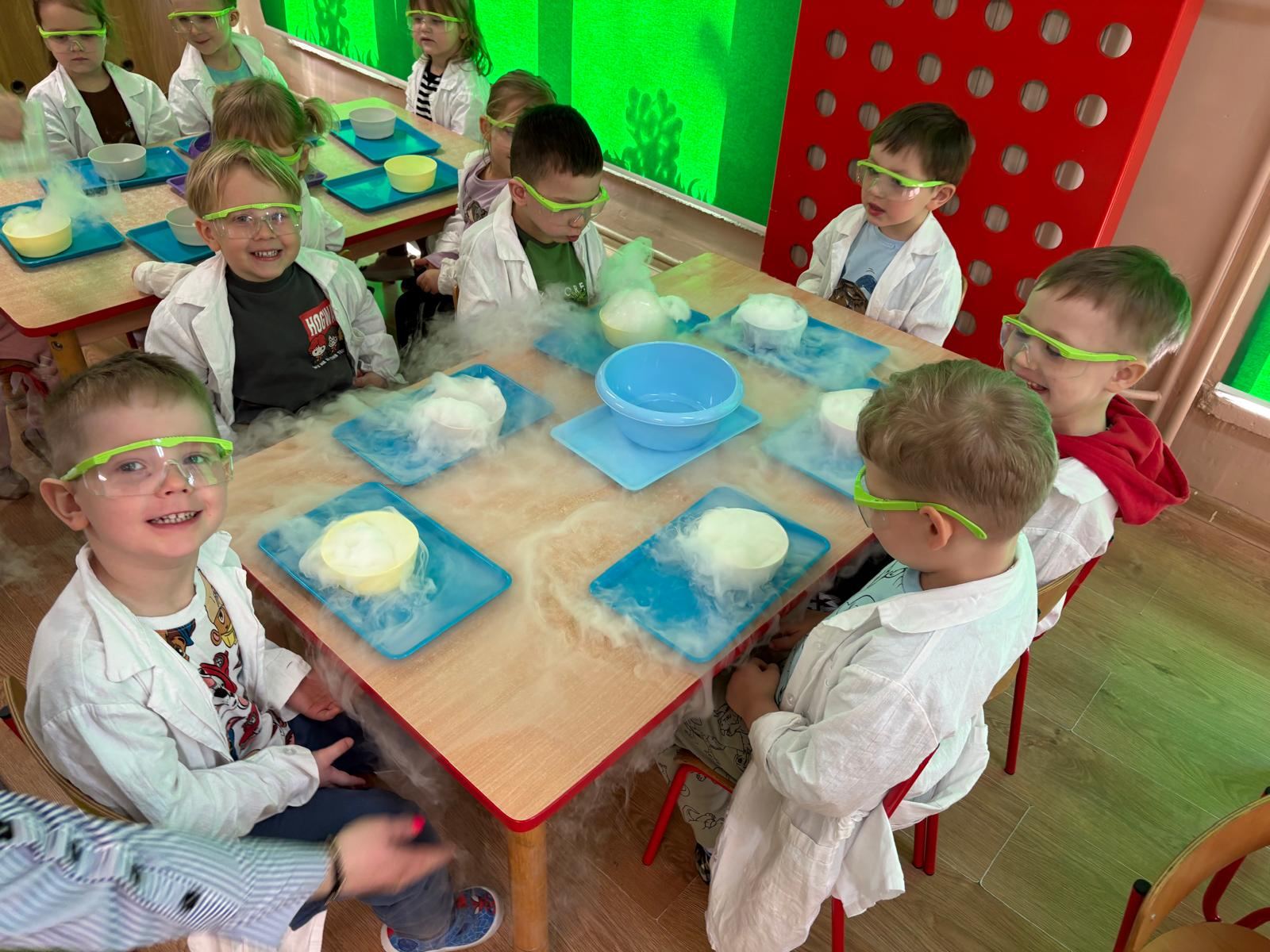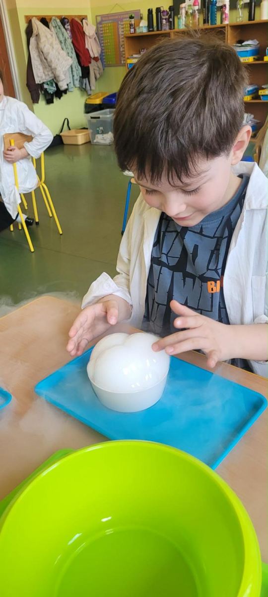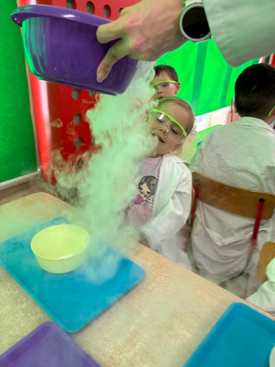 Główną atrakcją było doświadczenie z suchym lodem, dzięki któremu dzieci mogły zaobserwować zjawisko sublimacji – przejścia ze stanu stałego bezpośrednio w gazowy, z pominięciem stanu ciekłego. Warsztaty nie tylko dostarczyły mnóstwo radości, ale także rozbudziły ciekawość świata i chęć poznawania nauki poprzez zabawę.